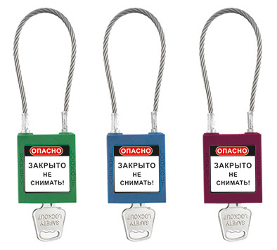 Замок безопасности с тросом Гаслок-8543-MKKA. Навесной замок, корпус из пластика АВС, дужка трос из нержавеющей стали 3,2 мм, длина 175 мм, мастер ключ, одинаковые ключи. Цвет - красный, оранжевый, желтый, зеленый, синий, черный, коричневый, серый, белый, фиолетовый