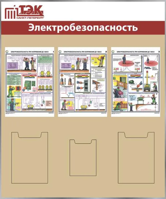 Стенд ТЭК Электробезопасность 3 плаката А3, 2 кармана А4, 1 карман А5 (1000х1200; Пластик ПВХ 4 мм, пластиковый профиль; Пластиковый белый)