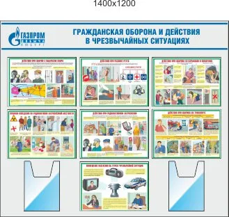 Стенд Гражданская оборона и действия в чрезвычайных ситуациях, 9 плакатов А3, Логотип (1500х1200; Пластик ПВХ 4 мм, алюминиевый профиль)