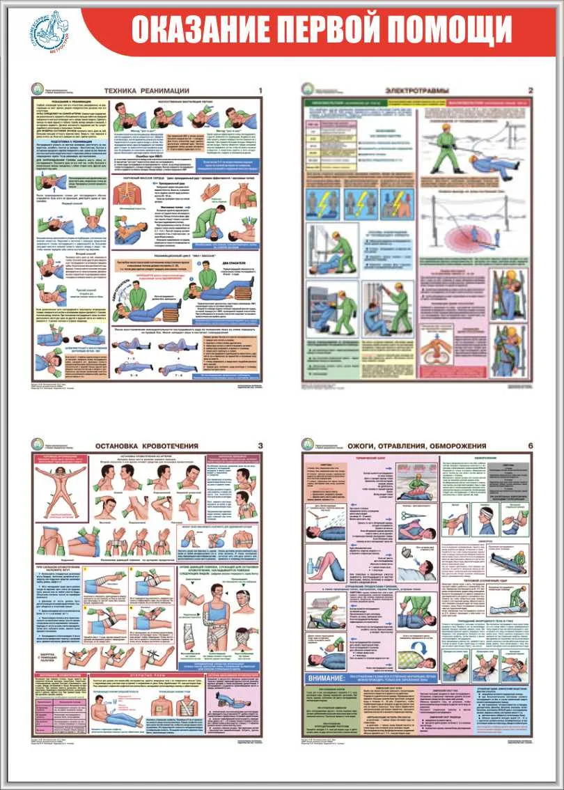 Стенды по охране труда Первая медицинская помощь 1200х1000 (пластик ПВХ 4 мм, 6 плакатов), логотип Газпром трансгаз (Пластик ПВХ 4 мм , пленка самоклеющаяся, алюминиевый профиль; )