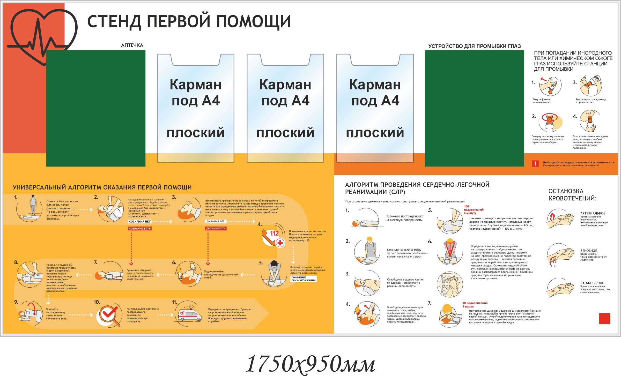 Стенд Первая медицинская помощь, 6 плакатов А3 (1100х1200; Пластик ПВХ 4 мм;Алюминиевый профиль)