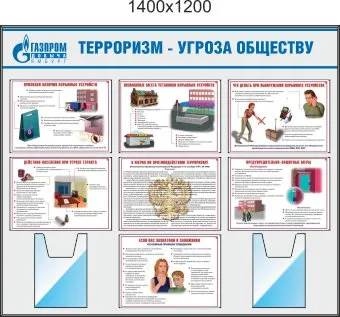 Уголки по охране труда Осторожно терроризм (Пластик ПВХ 4 мм,) 1500х1200, 3 плаката А 2, 4 плоских кармана - А 4 (Пластик ПВХ 4 мм, алюминиевый профиль; 1500х1200)