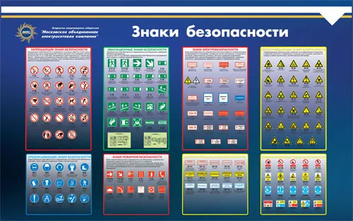 Индивидуальный Стенд Знаки безопасности, Логотип (1200х1000; Пластик ПВХ 4 мм, пластиковый профиль; Пластиковый) (полноцветная широкоформатная печать), Знаки безопасности по ГОСТ 12.4.026-01. 4 л.П4-ЗБ (Ламинированная бумага; А2)-1шт
