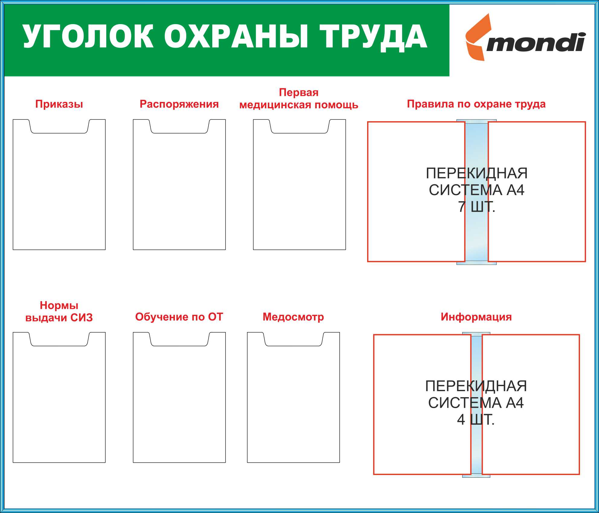 Стенд Уголок охраны труда в индивид. упаковке, карманы плоские А4 -6шт, перек. система А4 на 6 рамок (1400х1200; Пластик ПВХ 4 мм; Профиль ластиковый синий)