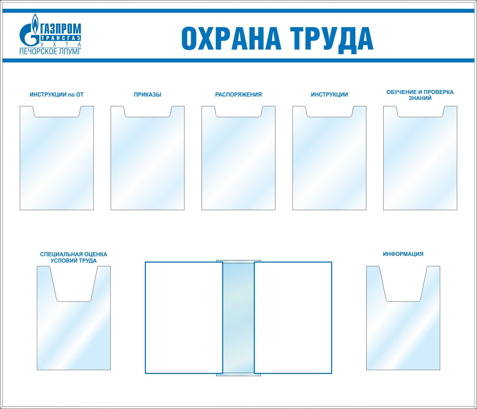 Стенд Охрана труда (карман плоский А4-4шт, карман объемный А4-2шт, карман А4 -2шт глубина 20мм) (1200х1000; Пластик ПВХ 4 мм, алюминиевый профиль; )