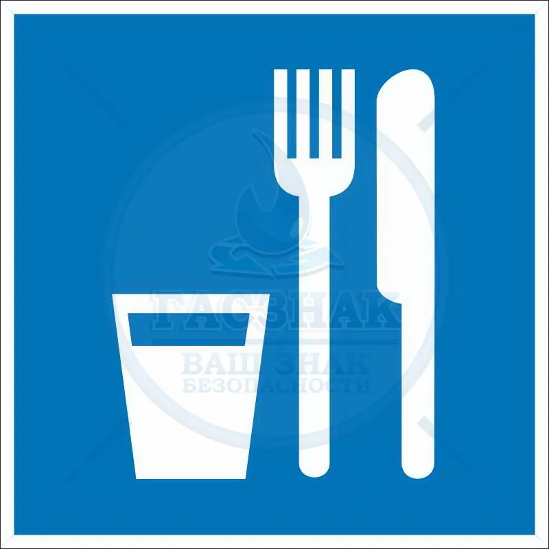 «Пункт (место) приема пищи» — универсальный знак, который используется в быту и на различных предприятиях, где не предусмотрена возможность принимать пищу прямо на рабочем месте. Носит информационный характер: указывает на места в здании, где разрешено есть. Размещается на дверях буфетов, столовых, других подобных помещений. Относится к числу указательных знаков, имеющих следующее цветовое исполнение: белая пиктограмма на синем прямоугольном фоне. В соответствии с ГОСТ имеет кодировку D01.С этим товаром также покупают