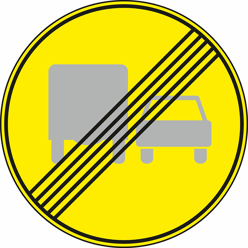 «Конец запрещения обгона грузовым автомобилям» оповещает водителей грузовиков о том, что участок, на котором нельзя обгонять другой транспорт, закончился. С места, где установлен знак, опережение другого транспорта грузовым машинам разрешен. Знак используют только в тех случаях, если распространять запрет обгона до перекрестка или пределов населенного пункта нет необходимости. На одно-, двух- или трехполосных дорогах с движением в обоих направлениях возможна установка только слева, на обороте запрещающего знака.